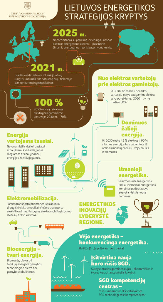 更新后的戰(zhàn)略預(yù)計(jì)到2030年 45%耗電量甚至達(dá)到90%。熱能將由可再生能源產(chǎn)生。2050年 立陶宛消耗的所有電力和熱量將來自可再生能源和其他非危險(xiǎn)源。可再生能源將達(dá)到80%。立陶宛消耗的所有能源。