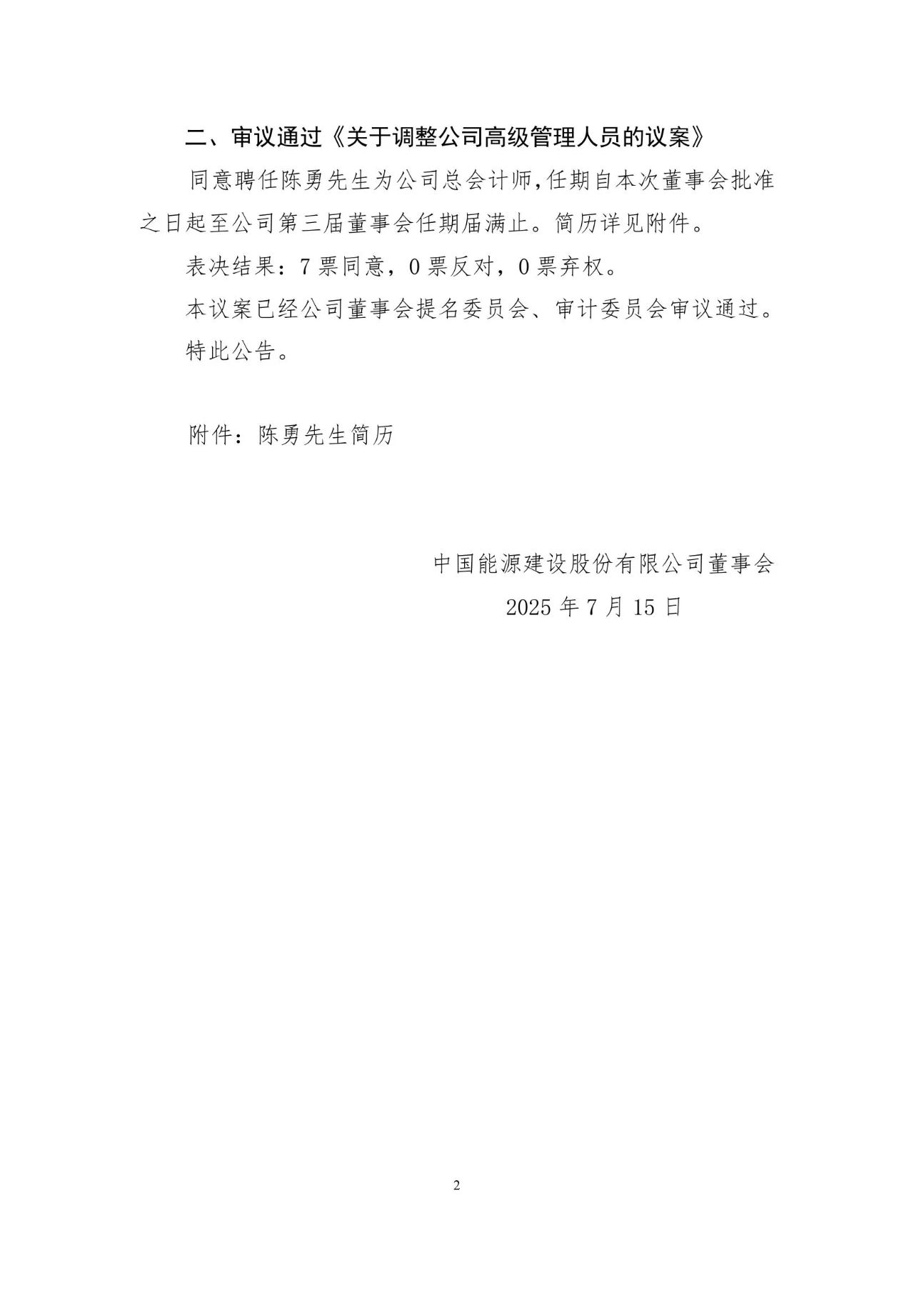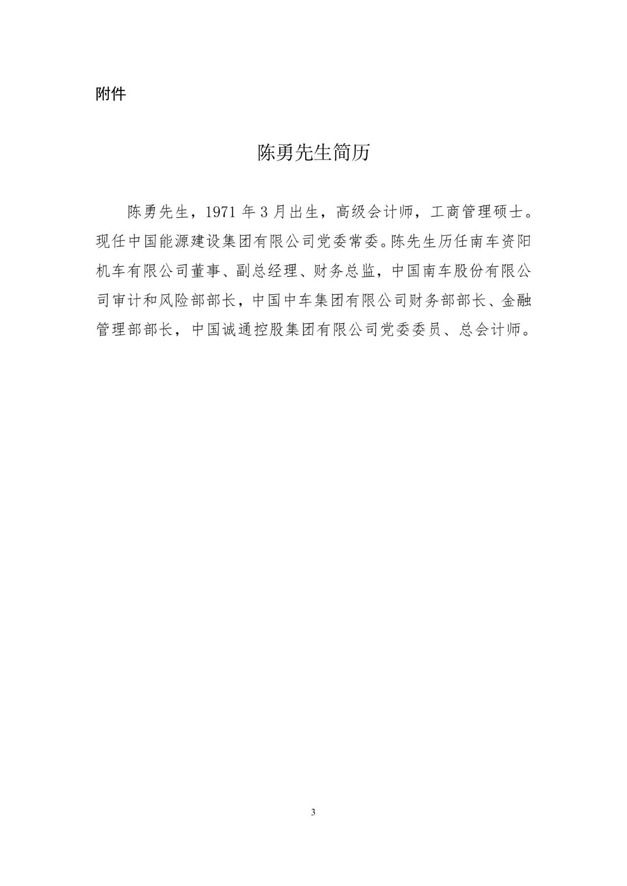 陳勇先生,1971年3月出生,高級會計師,工商管理碩士。現(xiàn)任中國能源建設(shè)集團有限公司黨委常委。陳先生歷任南車資陽機車有限公司董事、副總經(jīng)理、財務(wù)總監(jiān),中國南車股份有限公司審計和風(fēng)險部部長,中國中車集團有限公司財務(wù)部部長、金融管理部部長,中國誠通控股集團有限公司黨委委員、總會計師。