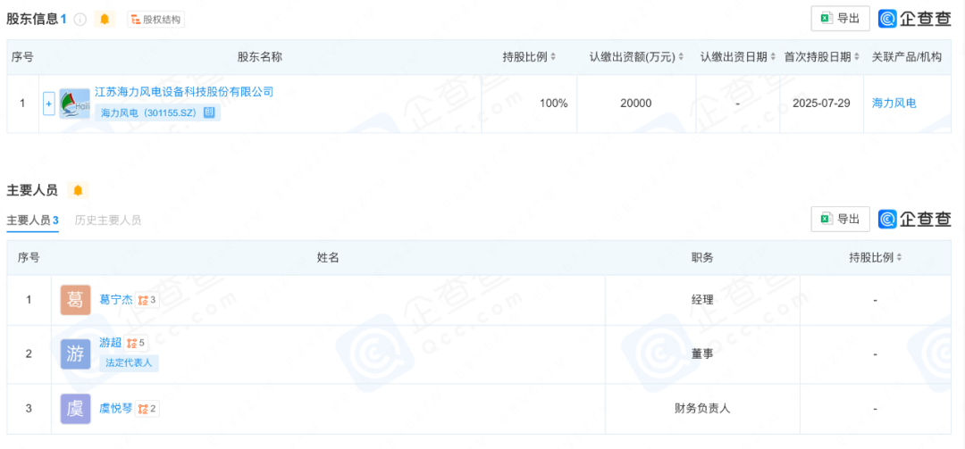 近日,海力海上風電裝備(溫州)有限公司成立,法定代表人為游超,注冊資本為20000萬元。新公司經營范圍包含:新能源原動設備制造;海上風電相關裝備銷售;海洋工程裝備制造;海洋工程裝備銷售;海洋工程平臺裝備制造;海洋能系統與設備銷售;海洋能系統與設備制造;海洋工程關鍵配套系統開發;海上風電相關系統研發;風電場相關系統研發;風電場相關裝備銷售等。企查查股權穿透顯示,該公司由江蘇海力風電設備科技股份有限公司100%持股。