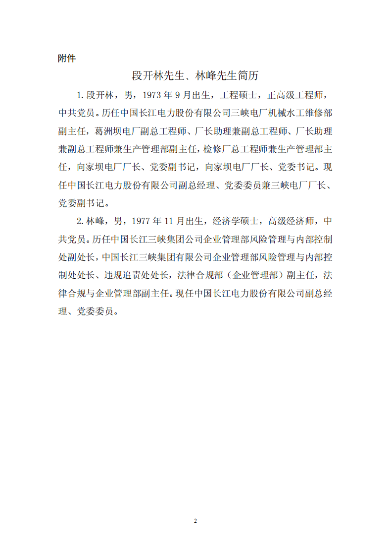 段開林、林峰任中國長江電力股份有限公司副總經理