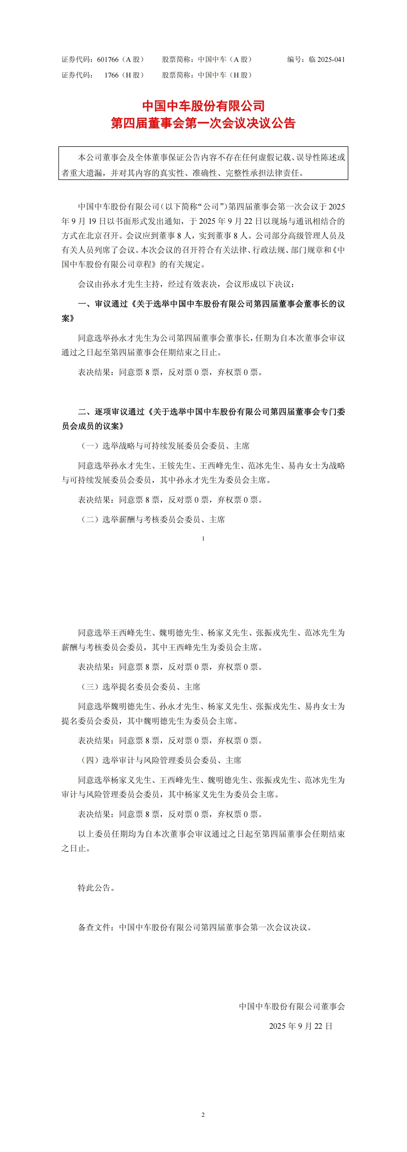 9月22日,中國中車股份有限公司第四屆董事會第一次會議在北京召開,審議通過董事長選舉議案,同意孫永才當選公司第四屆董事會董事長,任期自本次會議審議通過之日起至第四屆董事會任期結束。