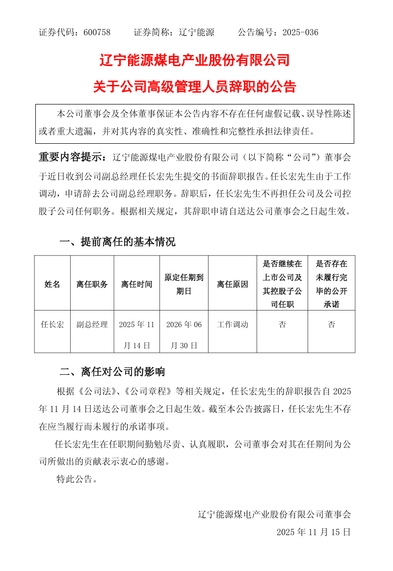 任長(zhǎng)宏辭去遼寧能源煤電產(chǎn)業(yè)股份有限公司副總經(jīng)理職務(wù)