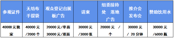 ●品牌展位:國(guó)內(nèi)企業(yè):(長(zhǎng)×寬×高:6m×3m×4.5m)¥30,000 / 18㎡;國(guó)際企業(yè):¥,40,000/18㎡(含鋼制桁架搭建、噴繪制作、地毯、洽談桌椅及照明等)