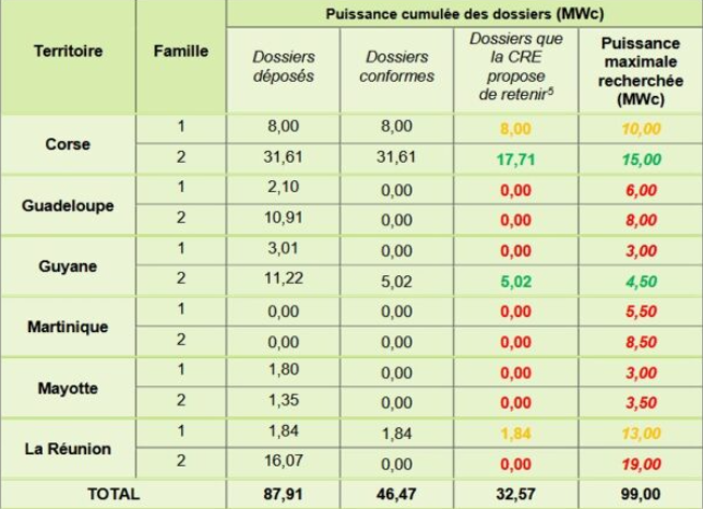 五個(gè)中標(biāo)項(xiàng)目分別位于法國(guó)的海外領(lǐng)土及科西嘉島。其中,阿庫(kù)奧能源公司位于科西嘉島阿萊里亞的弗拉索內(nèi)項(xiàng)目獲得了17.7兆瓦的容量,為最大中標(biāo)項(xiàng)目。其他中標(biāo)者包括索萊爾通用公司、沃爾塔利亞公司及阿爾比奧馬印度洋太陽(yáng)能公司等,項(xiàng)目地點(diǎn)分布于科西嘉島、法屬圭亞那和留尼汪島。