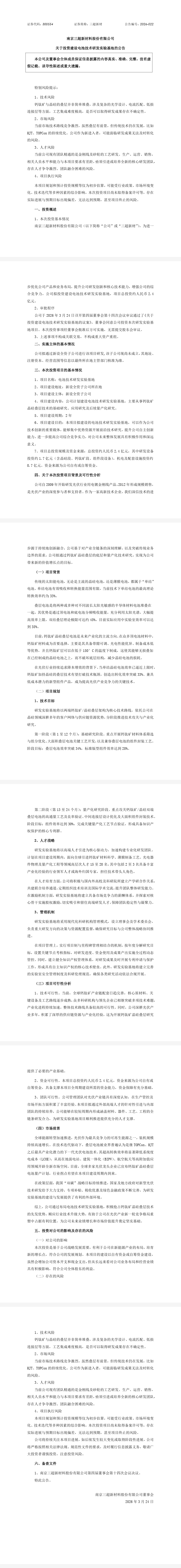 三超新材將通過新設(shè)全資子公司開展項(xiàng)目研發(fā),項(xiàng)目名稱為電池技術(shù)研發(fā)實(shí)驗(yàn)基地,建設(shè)地址為新設(shè)全資子公司所在地,建設(shè)周期 2 年,主要聚焦鈣鈦礦晶硅疊層技術(shù)的基礎(chǔ)、應(yīng)用及量產(chǎn)化研究,總投資 2.4 億元中,研發(fā)設(shè)備投資約 1.7 億元(含晶硅段、鈣鈦礦段、組件段設(shè)備),機(jī)電及配套設(shè)施投資約 0.7 億元,資金來源為公司自有或自籌資金。