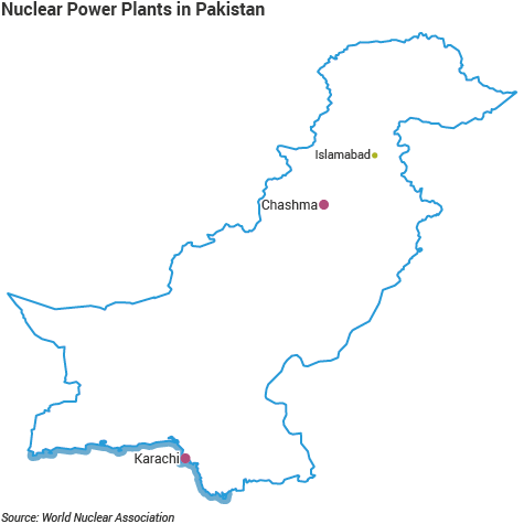 巴基斯坦有一個小型核電計劃,在中國的幫助下,運營容量為1355兆瓦,在建2300兆瓦。