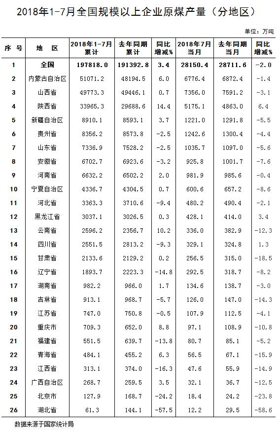 2018年1-7月全國(guó)各省區(qū)原煤產(chǎn)量排名發(fā)布