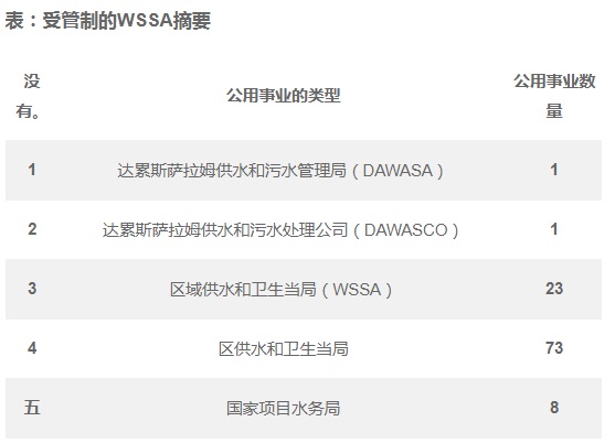 目前,EWURA管理130個供水和衛生當局,為區域和地區總部,小城鎮和國家項目水務局提供供水和衛生服務,如負責水資源部長宣布的受管制WSSA列表所示, 并總結如下。