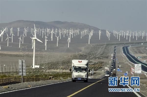 ↑汽車行駛在新疆吐魯番市郊區風力發電場一旁的公路上(9月22日攝)。新華社記者趙戈攝