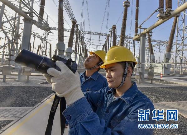 ↑在吐魯番市750千伏變電站,兩位工作人員利用專用設備對電力設施進行檢查(9月18日攝)。 新華社記者趙戈攝