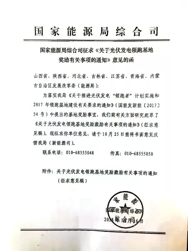 從國(guó)家能源局綜合司處獲悉,該局在日前印發(fā)了征求《關(guān)于光伏發(fā)電領(lǐng)跑基地獎(jiǎng)勵(lì)有關(guān)事項(xiàng)的通知》意見的函,就國(guó)能發(fā)新能【2017】54號(hào)中提出的領(lǐng)跑者基地獎(jiǎng)勵(lì)事宜征求相關(guān)發(fā)改委(能源局)的意見。
