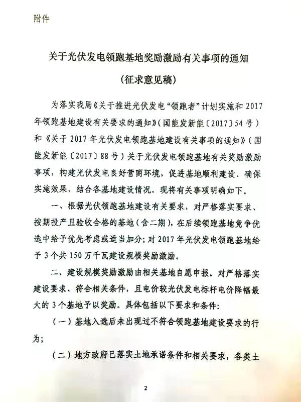 通知指出,根據(jù)光伏領(lǐng)跑基地建設(shè)有關(guān)要求,對(duì)嚴(yán)格落實(shí)要求、按期投產(chǎn)且驗(yàn)收合格的基地(含二期),在后續(xù)領(lǐng)跑基地競(jìng)爭(zhēng)優(yōu)選中給予優(yōu)先考慮或適當(dāng)加分;對(duì)2017年光伏發(fā)電領(lǐng)跑基地給予3個(gè)150萬(wàn)千瓦建設(shè)規(guī)模獎(jiǎng)勵(lì)激勵(lì)。