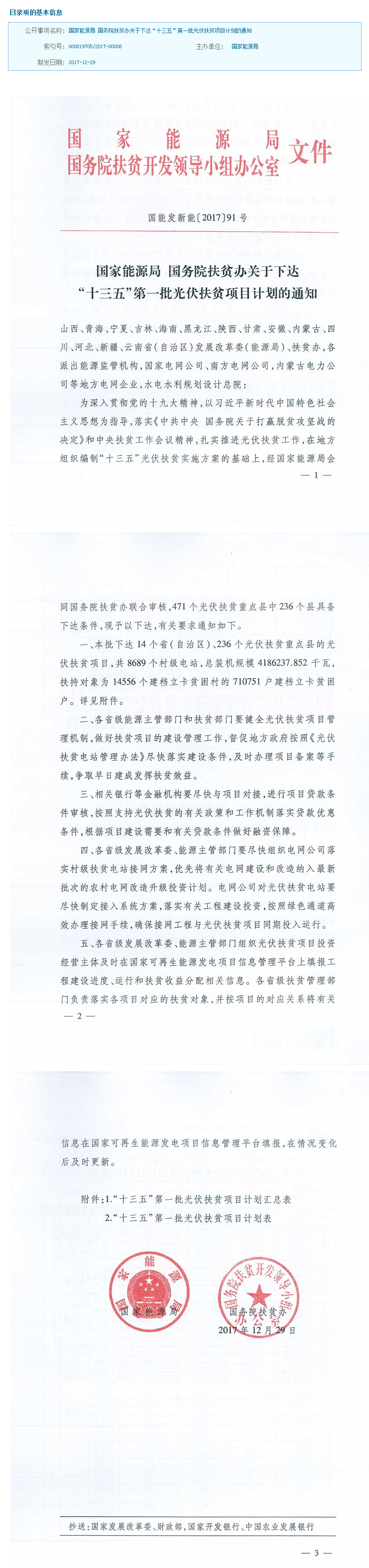 國家能源局 國務(wù)院扶貧辦關(guān)于下達“十三五”第一批光伏扶貧項目計劃的通知
