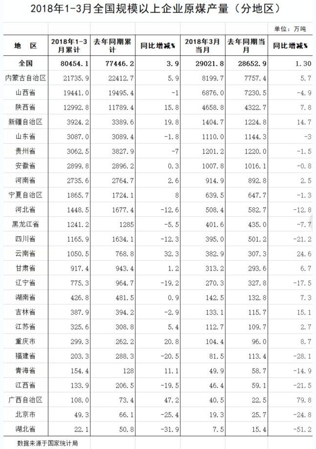 2018年1-3月全國規模以上分地區原煤產量