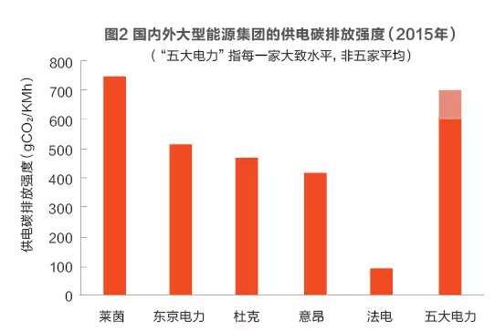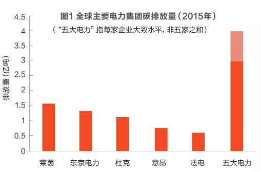 全球主要發(fā)電集團(tuán),包括法國電力(EDF)、意昂集團(tuán)(E.ON)、杜克能源(Duke Energy)、萊茵集團(tuán)(RWE)、東京電力(TEPCO),2015年各自碳排放總量大約在0.5~1.5億噸二氧化碳當(dāng)量的水平,同期中國的五大發(fā)電集團(tuán),每一家的碳排放總量均在3~4億噸二氧化碳當(dāng)量的水平(圖1),遠(yuǎn)高于全球主要發(fā)電集團(tuán)的水平,相當(dāng)于一個(gè)中等規(guī)模的發(fā)達(dá)國家的排放量(如英國),在排放量上可謂“富可敵國”。