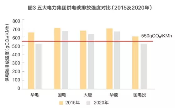 2016年發(fā)布的《“十三五”控制溫室氣體排放工作方案》要求2020年大型發(fā)電集團(tuán)單位供電二氧化碳排放控制在550克二氧化碳/千瓦時(shí)以內(nèi),根據(jù)對(duì)五大發(fā)電集團(tuán)已經(jīng)公開的“十三五”規(guī)劃部分?jǐn)?shù)據(jù)進(jìn)行測算,預(yù)計(jì)兩家有望完成指標(biāo)要求(國電投、華電),另外三家需要付出艱巨的努力,但能否完成仍然不容樂觀(圖3)。此外,《電力發(fā)展“十三五”規(guī)劃(2016-2020年)》同時(shí)提出,30萬千瓦級(jí)以上具備條件的燃煤機(jī)組全部實(shí)現(xiàn)超低排放,煤電機(jī)組二氧化碳排放強(qiáng)度下降到865克/千瓦時(shí)左右的目標(biāo)。