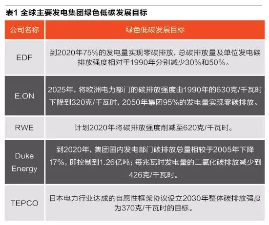 ?第二,規(guī)劃引領(lǐng),確立以“碳”為統(tǒng)領(lǐng)的發(fā)展目標(biāo)。落實(shí)碳排放管理,推行以“碳”為統(tǒng)領(lǐng)的發(fā)展目標(biāo)必須成為發(fā)電集團(tuán)實(shí)現(xiàn)總體戰(zhàn)略目標(biāo)的重要抓手。目前,全球主要發(fā)電集團(tuán)均確立了各自的碳排放控制目標(biāo)(表1)。中國大型發(fā)電集團(tuán)也不甘落后,以華能集團(tuán)為例,早在2010年的《華能集團(tuán)綠色發(fā)展行動(dòng)計(jì)劃》中,即提出到2020年集團(tuán)供電碳排放強(qiáng)度降至525gCO/KWh(目前看來,這個(gè)指標(biāo)完成的難度不小)、清潔能源裝機(jī)達(dá)到35%的低碳發(fā)展目標(biāo)。華電集團(tuán)在2017年集團(tuán)年度工作會(huì)議上,提出到2020年單位電能碳排放指標(biāo)較“十二五”末降低20%、單位電能化石能源消耗降低20克的低碳發(fā)展目標(biāo),引領(lǐng)集團(tuán)低碳發(fā)展新方向。