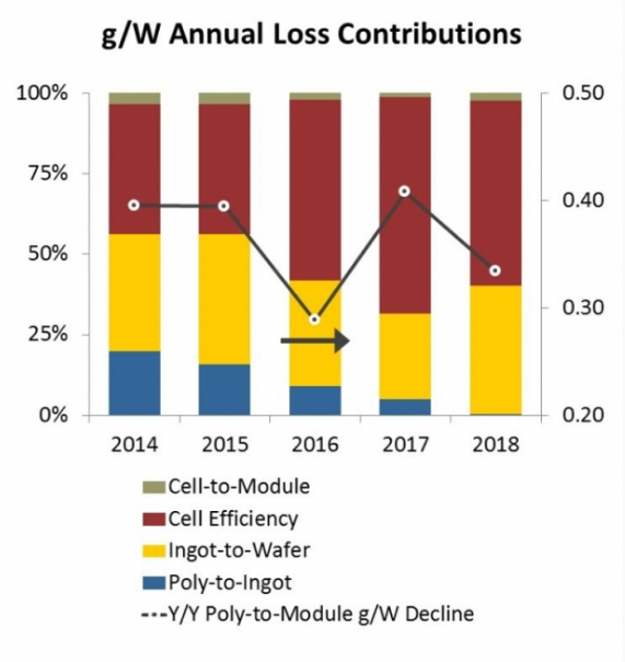 主要有兩種因素促成了多晶硅g/ W消耗量的下跌:金剛線切割和電池效率的提高(更多的使用單晶,尤其是PERC技術(shù))。到2018年年底,幾乎所有的硅片生產(chǎn)(單晶和多晶)都會(huì)使用金剛線,幾乎所有的單晶產(chǎn)品都會(huì)使用PERC技術(shù),而多晶產(chǎn)品將會(huì)經(jīng)歷自身PERC技術(shù)升級(jí)的階段。這些變化令其他階段發(fā)生的漸進(jìn)式改進(jìn)(鑄錠/拉錠、電池-組件損失和硅片厚度減少)相形見絀。