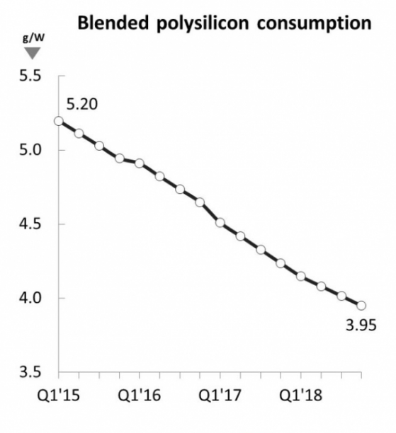 預(yù)計(jì)多晶硅消耗量在15年1季度和18年4季度之間下降了25%,在2018年結(jié)束時(shí)混合水平下降到3.9g/W。