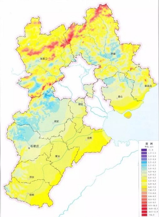 圖1-河北省70m高度層30年平均風速分布圖