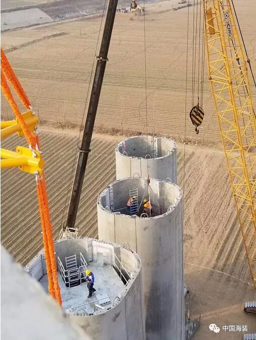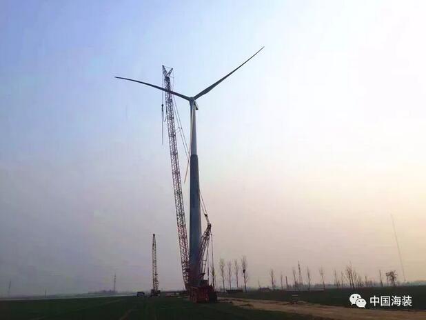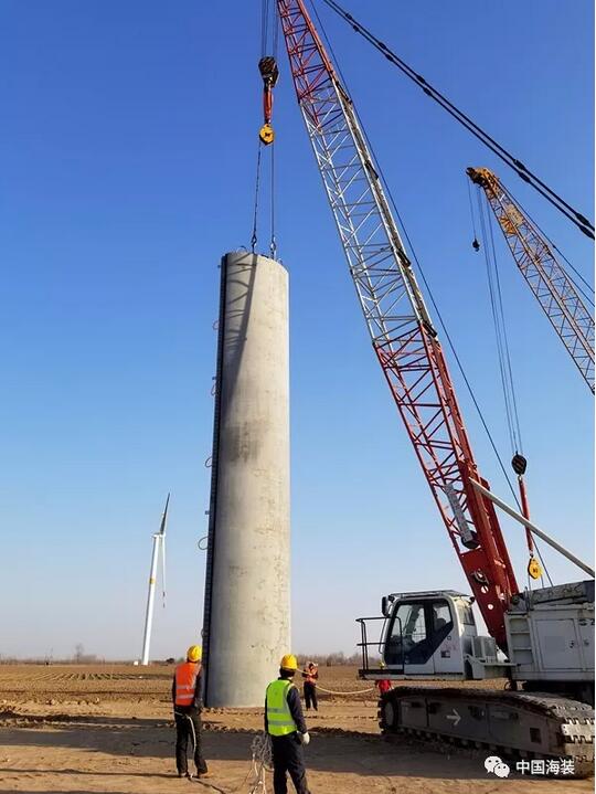 2017年7月,中國海裝正式啟動120米輪轂高度鋼混塔筒研制項目,12月開始塔筒吊裝工作。整個項目在歷經九個月的精耕細作后,于2018年3月22日,完成樣機吊裝工作。