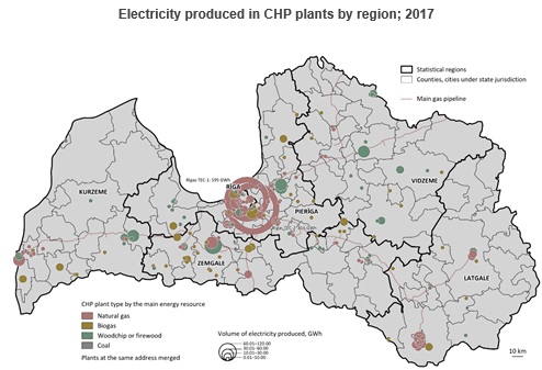 2017年,RES在熱電聯產電廠生產的電力的最大份額在Vidzeme和Zemgale地區分別登記 - 分別為89%和82%,而在里加則為最小份額 - 占該地區總電量的3%。