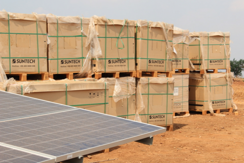 除了一些太陽能電池陣外,還有一大堆裝有尚德標志的盒子。這些模塊正在休息,不久將在本月內運送到英雄在該州建立的400兆瓦其他光伏容量。